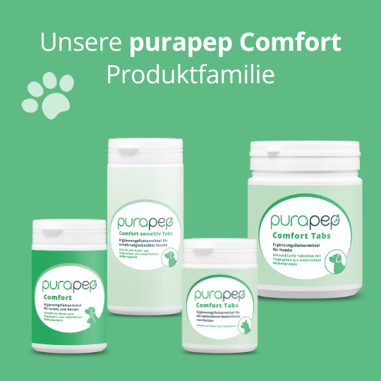 Eine wertvolle Ergänzung solcher Maßnahmen sind natürliche Futterergänzungen, die eine positive Unterstützung bei Angst und Stress bieten. Unsere auf Molkenproteinen basierenden Produkte der purapep Comfort-Reihe, beinhalten Tryptophan, die wichtigste B-Vitamine und Nährstoffe und können so Ihren Hund und Ihre Katze bei einer Neigung zu Angstverhalten und Stress optimal versorgen. Die ideale Ergänzung für ein sinnvolles Gleichgewicht zwischen Tryptophan und Serotonin.