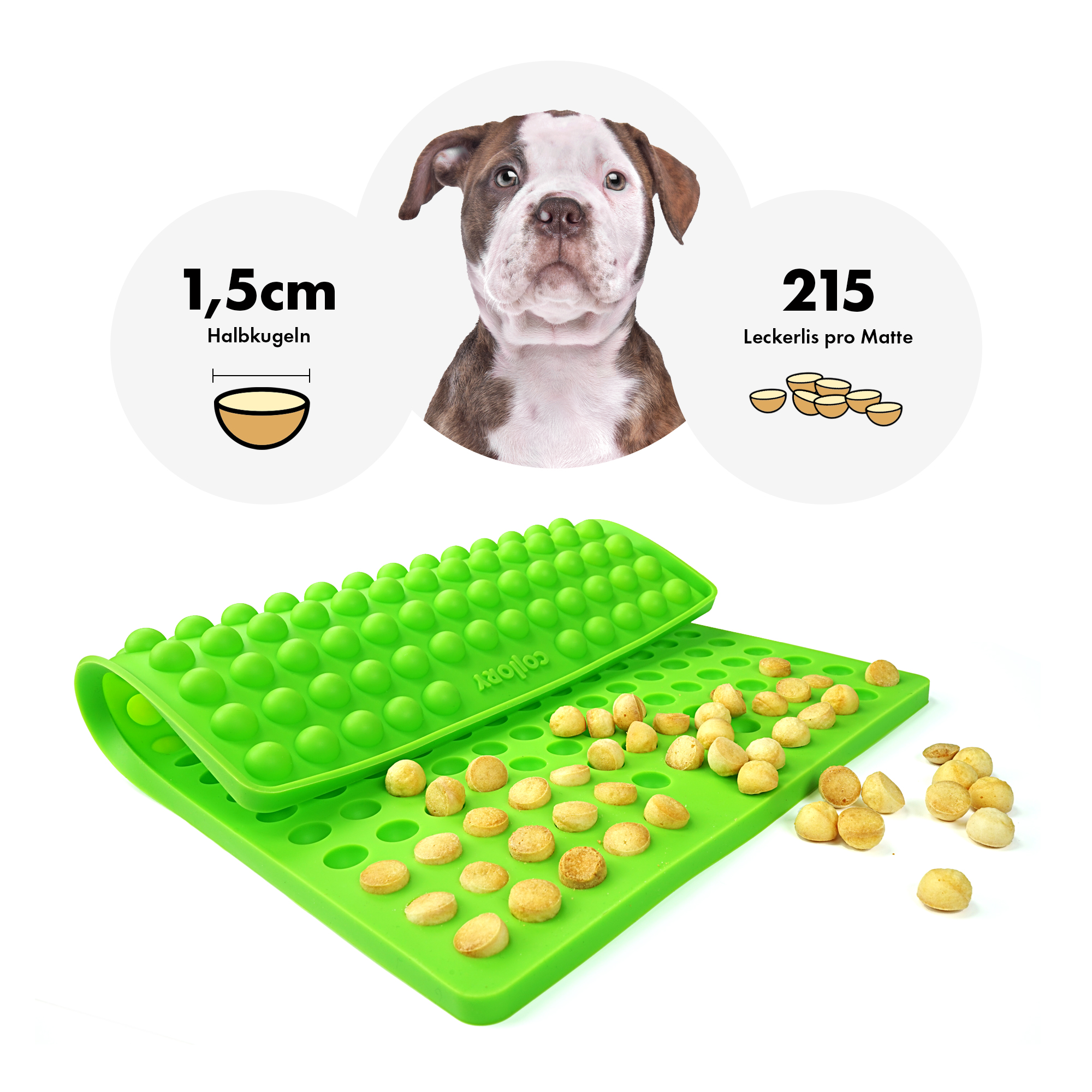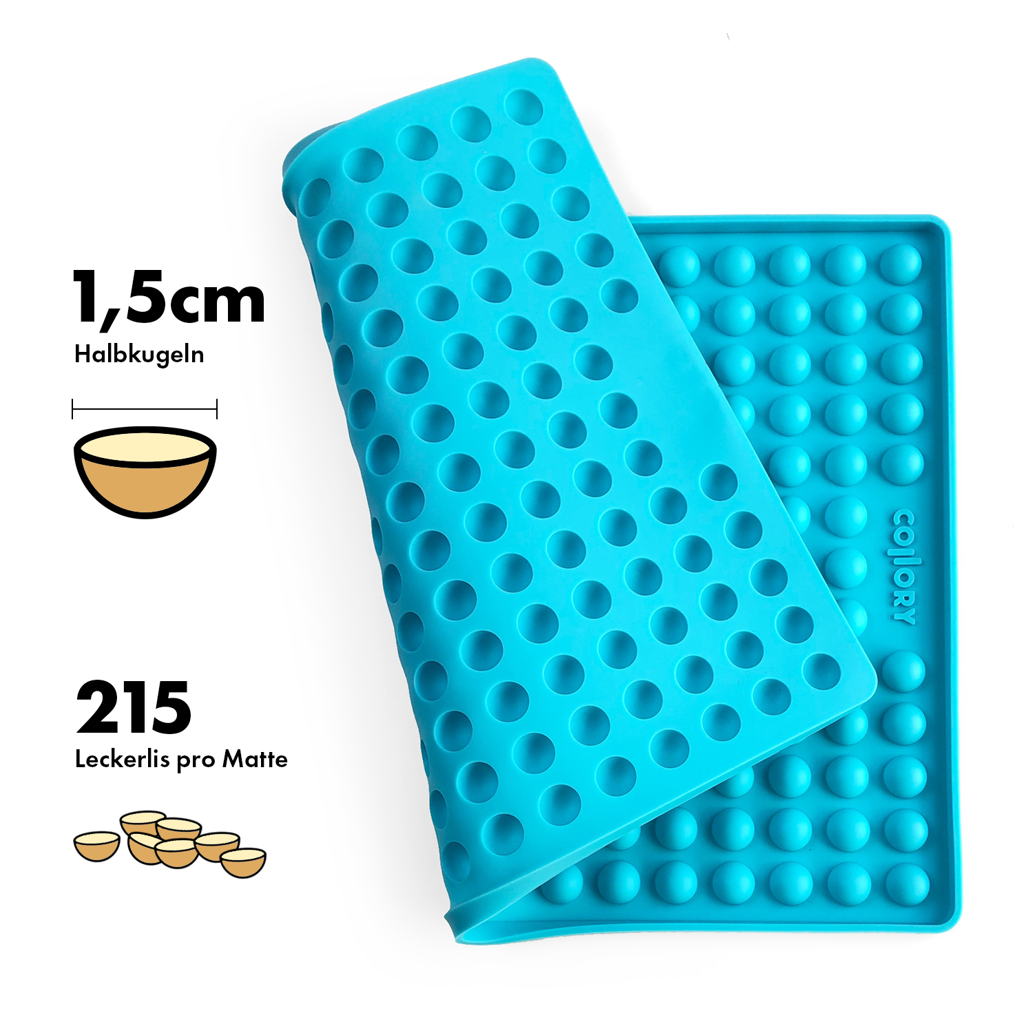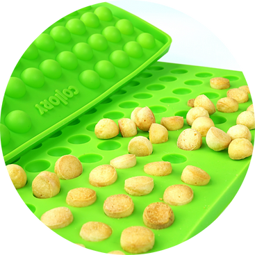 Die Collory Halbkugel-Backmatte Medium ( Ø 1,5cm) ist perfekt für alle, die ihren Vierbeinern gesunde und individuelle Snacks selbst zubereiten möchten. Dank der kleinen Mulden lassen sich Leckerlis ganz einfach portionieren – ideal für Training, Belohnung oder zur Ergänzung mit funktionalen purapep-Produkten wie dem purapep Comfort Pulver oder anderen Mischungen in Pulverform. Die flexible Silikonmatte eignet sich sowohl zum Backen als auch zum Einfrieren – für ganzjährige Snackfreuden.