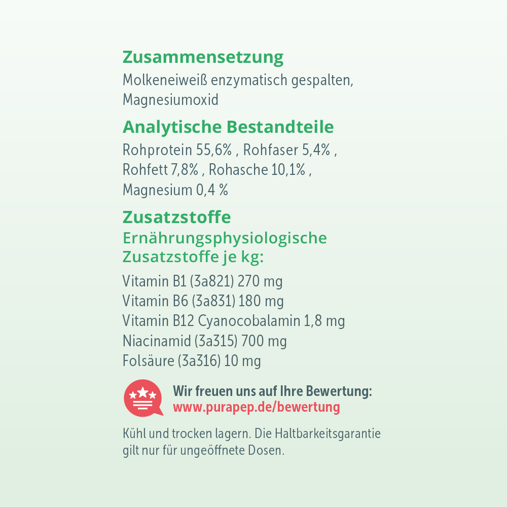 Einige Rassen, wie der Riesenschnauzer und unser Shar Pei leiden rassebedingt an einem Vitamin B12-Mangel. Es gibt viele Produkte auf dem Markt, da unsere Fellnase sehr ernährungssensibel ist, hatten wir bisher kein geeignetes für BALU gefunden. Bis wir auf Purapep zufällig gestoßen sind. Natürlich habe ich erst einmal das Produktblatt mit der ganz genauen Zusammensetzung sehr genau gelesen und für gut befunden !