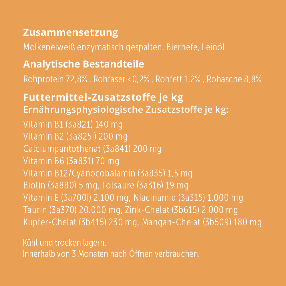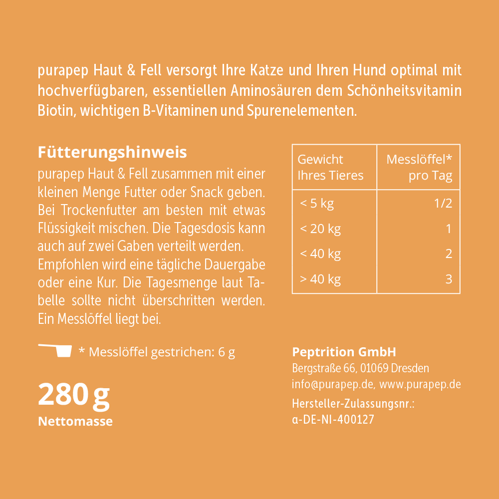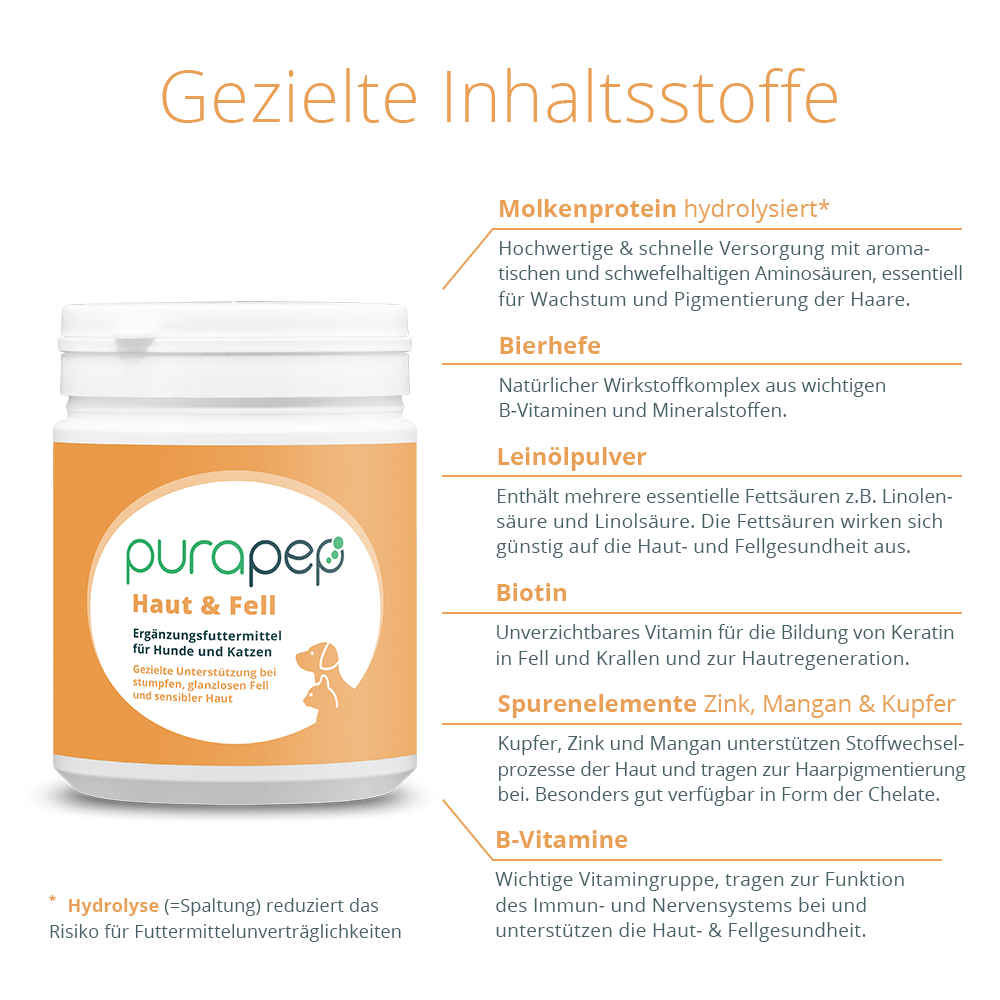 Ein gesundes Fell ist wichtig, denn dieses begleitet Ihre Fellnase wie ein Schutzmantel durchs ganze Leben. Der Fellaufbau und die Erneuerung der Haut ist keine einfache Aufgabe, aber mit der richtigen Ernährung kann dieser Prozess gezielt unterstützt werden. Deshalb verbindet purapep Haut & Fell hochwertige Eiweißbausteine aus der Molke, wertvolle B-Vitamine und Spurenelemente mit dem Naturprodukt Bierhefe zur gezielten Ergänzung der Haut- und Fellgesundheit.