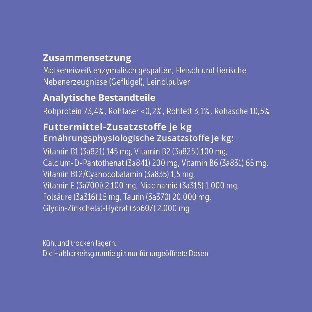 purapep Senior verbindet hochwertige Eiweißbausteine der Molke mit wertvollen Omega-3-Fettsäuren, Antioxidantien und Taurin für die gezielte Unterstützung älterer Fellnasen. Mit einem hohen Gehalt an essentiellen Aminosäuren wie Leucin, unterstützen Molkenproteine gezielt das Muskelwachstum und die Muskelregeneration.